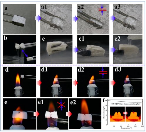 圖:納米帶氣凝膠在液氮、火焰、高溫空氣氛圍(>1000°C)下,承受不同載荷的柔性形變-回彈行為