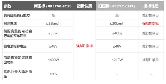 由于舊國標(biāo)中除了最高車速、制動(dòng)性能以及車架/前叉組合件強(qiáng)度為強(qiáng)制性條款之外,其余指標(biāo)均為推薦性條款,這就給生產(chǎn)廠商提供了回旋的余地,根據(jù)1999年電動(dòng)自行車國標(biāo)(GB17761-1999)的相關(guān)規(guī)定,符合要求的輕便電動(dòng)踏板車也可歸類于電動(dòng)自行車范圍,故在新國標(biāo)實(shí)施前,傳統(tǒng)意義上的電動(dòng)自行車與電動(dòng)輕便摩托車均統(tǒng)一歸為電動(dòng)自行車范疇,也造成了產(chǎn)品檢驗(yàn)合格的同時(shí)卻是“超標(biāo)車”的尷尬局面。而新國標(biāo)的“全部技術(shù)指標(biāo)”都變成了強(qiáng)制性的硬指標(biāo),各項(xiàng)安全指標(biāo)不再是“選擇題”,從生產(chǎn)根源上杜絕了“超標(biāo)合格車”的存在。這也意味著,今后不具有腳踏騎行功能的輕便電動(dòng)踏板車也將被排除在電動(dòng)自行車范疇之外。