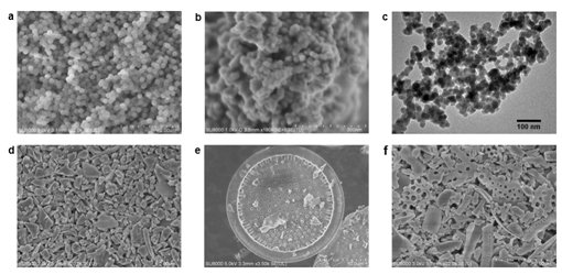 (a)人造納米SiO2標(biāo)準(zhǔn)品;(b-c)工業(yè)白炭黑;(d)天然石英顆粒;(e-f)天然硅藻土的完整形貌及碎片