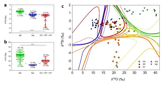 (a)Si同位素指紋;(b)O同位素指紋;(c)Si-O二維同位素指紋及機(jī)器學(xué)習(xí)分類模型(簡寫:ND:天然硅藻土;NQ:天然石英;ES:人造溶膠凝膠法SiO2;EP:人造沉淀法SiO2;EF:人造氣相法SiO2)
