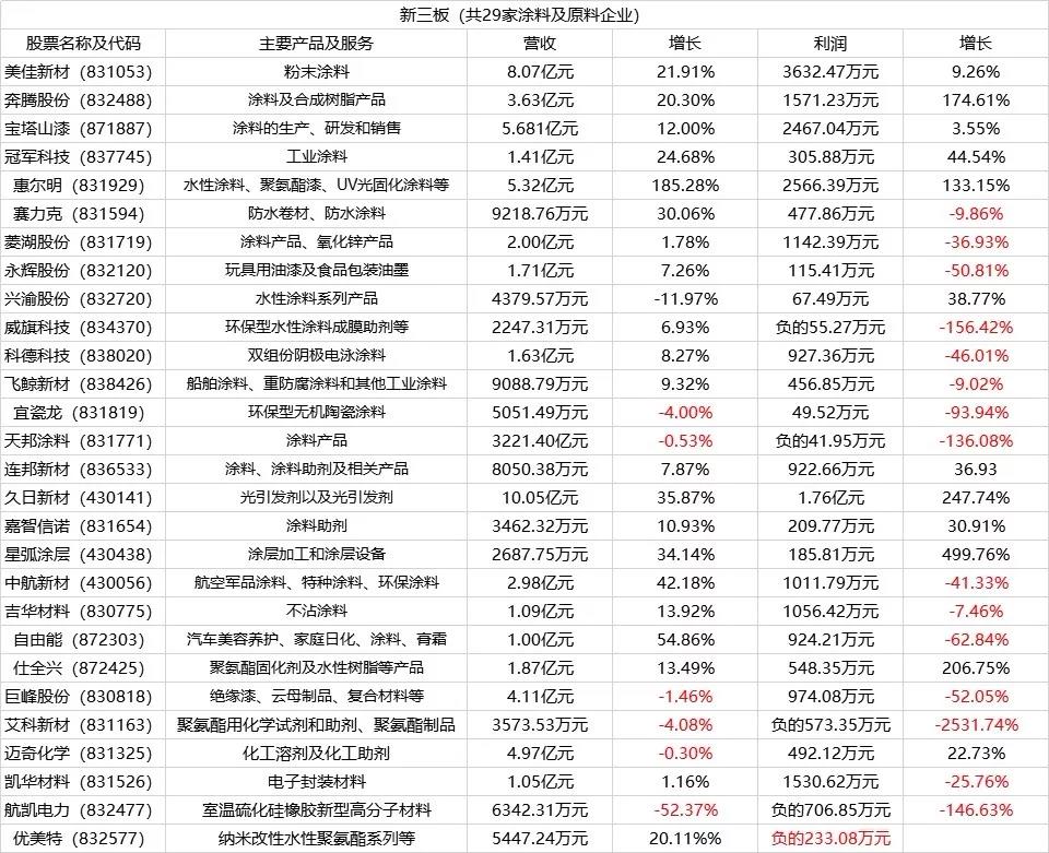 從29家公布的財報數(shù)據來看,有10家實現(xiàn)營收和凈利潤實現(xiàn)雙增長,它們分別是美佳新材、奔騰股份、寶塔山漆、冠軍科技、惠爾明、連邦新材、久日新材、嘉智信諾、星弧涂層、仕全興。