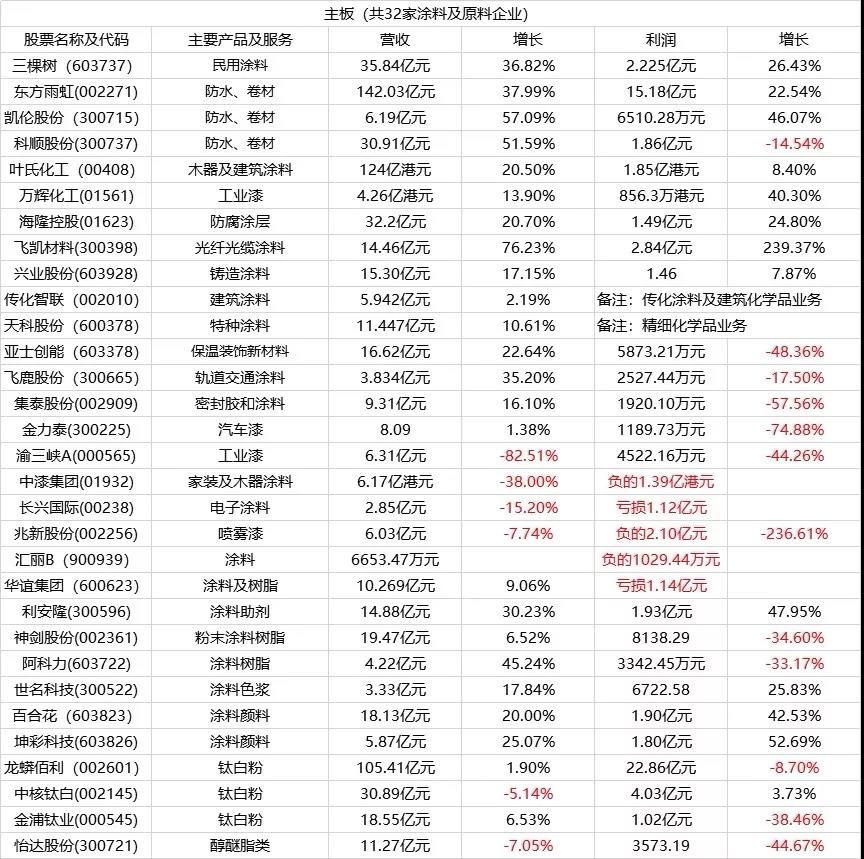從主板32家公布的財報數(shù)據來看,僅有12家實現(xiàn)營收和凈利潤雙增長的情況,它們分別是三棵樹、東方雨虹、凱倫股份、葉氏化工、萬輝化工、海隆控股、飛凱材料、興業(yè)股份、利安隆、世名科技、百合花、坤彩科技。