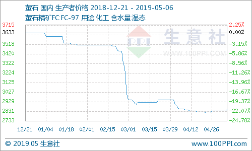 中國粉體網(wǎng)訊 5月5日螢石商品指數(shù)為99.47,與昨日持平,較周期內(nèi)最高點127.49點(2019-01-03)下降了21.98%,較2016年12月18日最低點49.21點上漲了102.13%。(注:周期指2011-09-01至今)