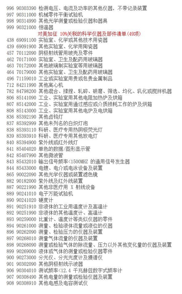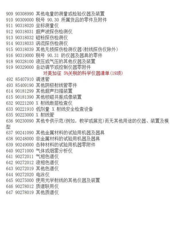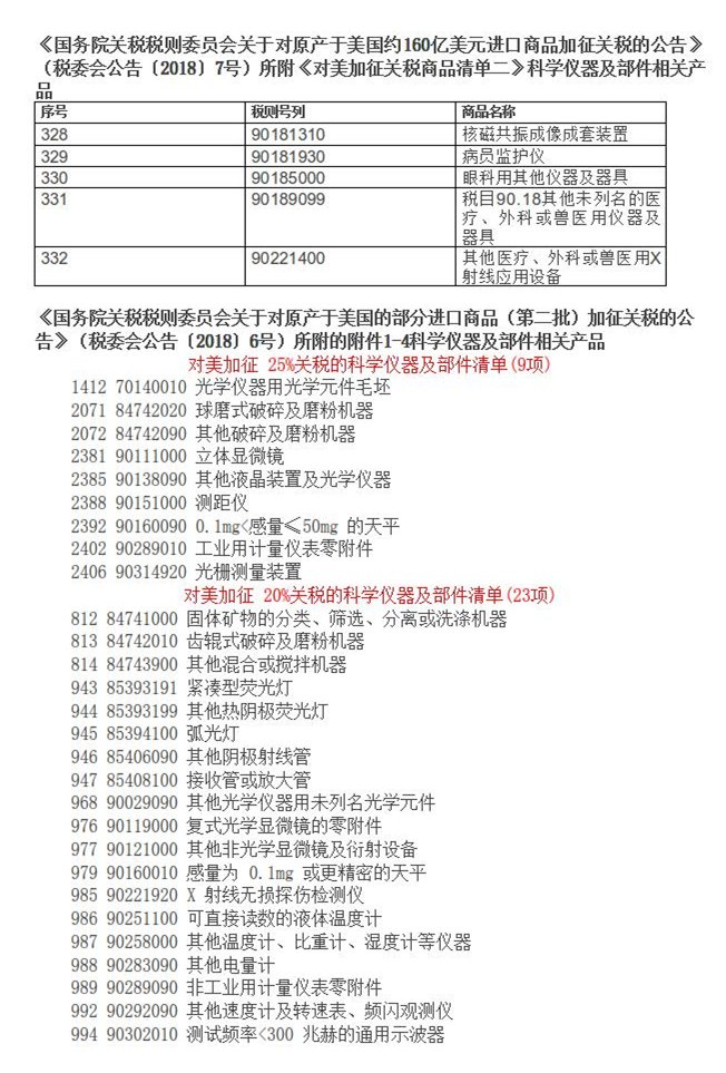 在可申請排除的商品名單中:《國務(wù)院關(guān)稅稅則委員會關(guān)于對原產(chǎn)于美國500億美元進口商品加征關(guān)稅的公告》(稅委會公告〔2018〕5號)所附《對美加征關(guān)稅商品清單一》商品不含科學(xué)儀器及部件相關(guān)產(chǎn)品!秶鴦(wù)院關(guān)稅稅則委員會關(guān)于對原產(chǎn)于美國約160億美元進口商品加征關(guān)稅的公告》(稅委會公告〔2018〕7號)所附《對美加征關(guān)稅商品清單二》商品名錄中有5類與科學(xué)儀器及部件相關(guān)!秶鴦(wù)院關(guān)稅稅則委員會關(guān)于對原產(chǎn)于美國的部分進口商品(第二批)加征關(guān)稅的公告》(稅委會公告〔2018〕6號)所附的附件1-4商品名錄中有100類與科學(xué)儀器及部件相關(guān)。相關(guān)在可申請排除的科學(xué)儀器及部件相關(guān)名單,匯總?cè)缦拢?/p>