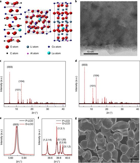 為此,華為中央研究院聯(lián)合美國(guó)阿貢國(guó)家實(shí)驗(yàn)室通過(guò)La和Al摻雜,將LiCoO2的穩(wěn)定電壓提高到了4.5V,可逆容量達(dá)到190mAh/g,其中La能夠增加LCO材料在c軸方向上的晶胞參數(shù),Al則能夠起到促進(jìn)Li+擴(kuò)散、穩(wěn)定晶體結(jié)構(gòu)和防止LCO材料相變的作用,兩者相互作用顯著改善了LCO材料在高電壓下的結(jié)構(gòu)穩(wěn)定性,循環(huán)50次后仍然能夠保持96%的容量,并使得LCO材料的倍率性能得到了大幅提高。