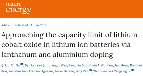 第二項(xiàng)成果:Approaching the capacity limit of lithium cobalt oxide in lithium ion batteries via lanthanum and aluminium doping(通過(guò)摻雜鑭和鋁,使鋰離子電池中的鈷酸鋰接近理論容量)。該成果是華為中央研究院聯(lián)合美國(guó)阿貢國(guó)家實(shí)驗(yàn)室通過(guò)摻雜La和Al,將LiCoO2的穩(wěn)定電壓提高到了4.5V,可逆容量達(dá)到190mAh/g。