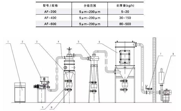 1.控制柜 2.自動加料機(jī) 3.氣流分級機(jī) 4.PVC軟管 5.旋風(fēng)分離器 6.捕集器 7.手動蝶閥 8.高壓風(fēng)機(jī) 9.不銹鋼過渡料倉 10.氣動蝶閥