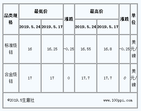 根據(jù)生意社數(shù)據(jù)監(jiān)測顯示:本周國內(nèi)鈷市繼續(xù)下跌,鈷價(jià)震蕩下跌,總體鈷價(jià)無力反彈上漲。截至5月24日鈷價(jià)245000.00元/噸,較上周末5月19日鈷價(jià)251833.33元/噸下跌,跌幅2.71%。國際鈷價(jià)下跌,拖累國內(nèi)鈷市,國內(nèi)鈷價(jià)再次震蕩下跌。