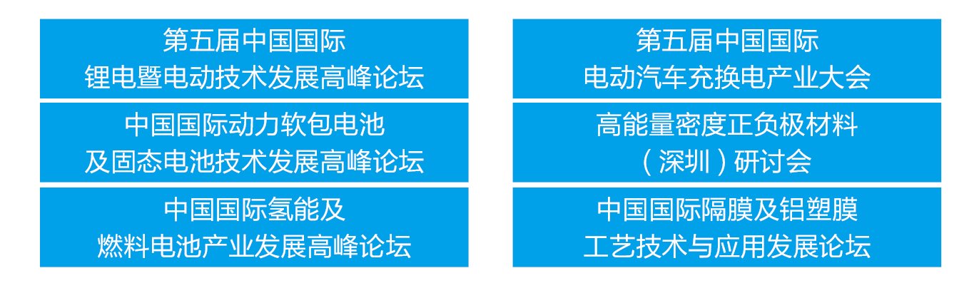展會同期舉辦:2019 第五屆中國國際鋰電暨電動技術發(fā)展高峰論壇、中國國際動力軟包電池及固態(tài)電池技術發(fā)展高峰論壇、高能量密度正負極材料(深圳)研討會、深圳電動出行展、深圳氫能暨燃料電池展、深圳充電樁技術設備展、2019 中國鋰電池行業(yè)年度品牌評選活動。
