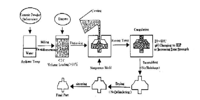 將生物酶技術(shù)、膠態(tài)化學(xué)及陶瓷工藝學(xué)融為一體,通過改變料漿pH值,或者增加料漿體系中離子強(qiáng)度從而降低粉體表面電荷來成型。