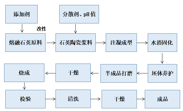 因此,熔融石英陶瓷注凝成型不僅兼具了其它膠態(tài)成型的優(yōu)點,且克服了其它膠態(tài)成型方法的缺點,具有以下特點: