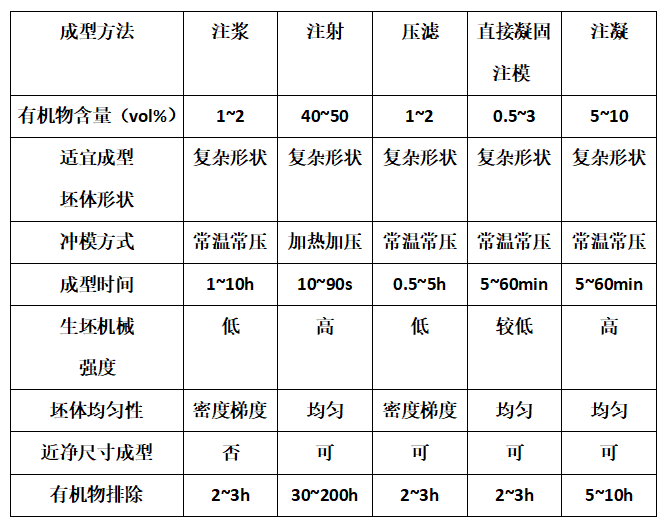與注射成型相比,注凝成型方法有機(jī)物含量少,無脫脂排塑的困難;