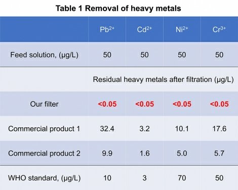 由香港大學土木工程系唐楚陽教授領導的一個研究小組發(fā)現(xiàn),這種膜可以快速過濾鉛(Pb),鎳(Ni),鎘(Cd)和鉻(Cr)等重金屬在消除大腸桿菌和枯草芽孢桿菌等細菌的同時,效率超過99.9%。膜過濾器易于通過重力驅(qū)動的過濾工藝操作,并且可以在用醋沖洗后重復使用。