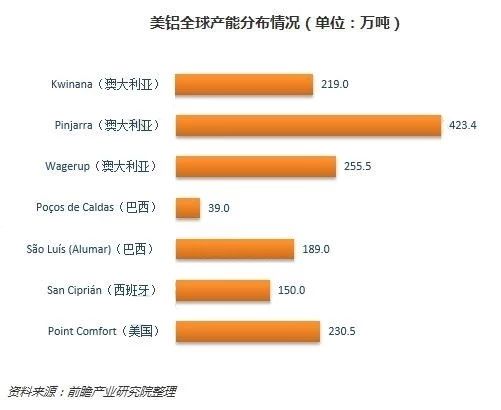 根據(jù)美國鋁業(yè)2017年年報(bào),其在各氧化鋁工廠擁有的權(quán)益產(chǎn)能約15064千噸,其中位于美國的產(chǎn)能約2305千噸。