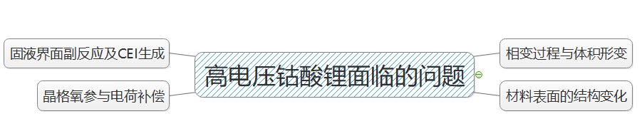 在鈷酸鋰電極材料的探索中,高電壓鈷酸鋰的探索一直是縈繞在研究人員心中。在早期的鈷酸鋰探索中,當(dāng)電壓高于4.25V時(shí),電池的循環(huán)性能出現(xiàn)了快速的衰減,此時(shí)鈷酸鋰材料六方晶相開始向單斜相轉(zhuǎn)變。相關(guān)研究表明單斜相變與電池性能衰減之間的關(guān)系如下:相變過(guò)程中材料體積變化導(dǎo)致材料性能變化;相變不可逆造成容量衰減與結(jié)構(gòu)破壞;表面副反應(yīng)進(jìn)一步加;過(guò)渡金屬溶解加速Li源消耗;氧參與電荷轉(zhuǎn)移進(jìn)一步氧化電解液。隨著對(duì)材料改性技術(shù)的運(yùn)用,相關(guān)高電壓鈷酸鋰材料取得了長(zhǎng)足的進(jìn)步,然而關(guān)于高電壓鈷酸鋰材料的研究依然愛不得不面對(duì)如下幾個(gè)問題: