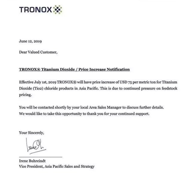 然而,在國內(nèi)鈦白粉價格頻頻下跌的時間里,國外鈦白粉市場行情是怎樣的呢?就在6月份,國際鈦白粉巨頭特諾發(fā)布漲價函,稱由于原料定價帶來的壓力,7月1日起鈦白粉上調(diào)75美金/噸,折合人民幣每噸上漲519元。