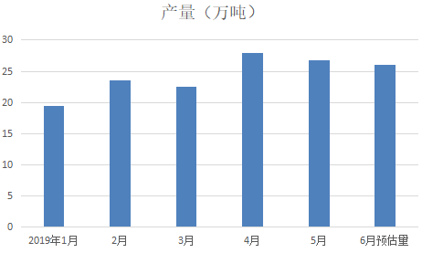 截至2019年1-5月,全國鈦白粉產(chǎn)量為121.11萬噸,在4月份產(chǎn)量達(dá)到27.89萬噸,隨著價格下跌,5月產(chǎn)量下降,預(yù)計(jì)6月產(chǎn)量繼續(xù)下滑,按照6月平均開工率80%估算,6月預(yù)估量26萬噸左右。