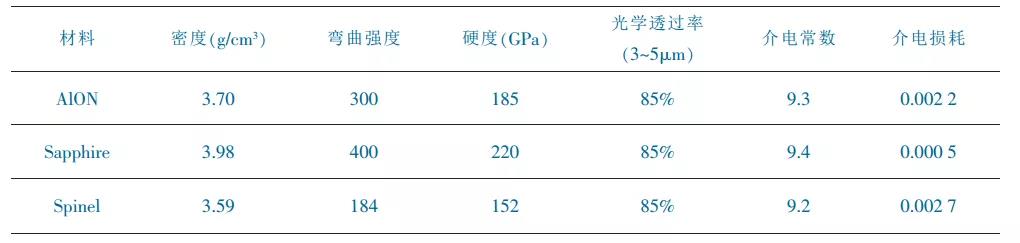 AlON、藍(lán)寶石(sapphire)和尖晶石(MgAl2O4)三種常用的中紅外材料的性能對(duì)比如表1所示,可以看出,AlON陶瓷的光學(xué)性能與藍(lán)寶石、尖晶石、氧化釔相當(dāng)(中紅外透光率>80%),而抗彎強(qiáng)度與藍(lán)寶石接近(300MPa),明顯高于尖晶石(190MPa)和氧化釔(160MPa)。由于藍(lán)寶石單晶窗口材料的制備成本非常高,且大尺寸很難制備,而AlON陶瓷則可以通過先進(jìn)陶瓷制備方法實(shí)現(xiàn)大尺寸及復(fù)雜樣品的制備,并具有光學(xué)各向同性的優(yōu)點(diǎn),因此AlON陶瓷已成為高性能雙模天線罩和中紅外窗口的首選材料。