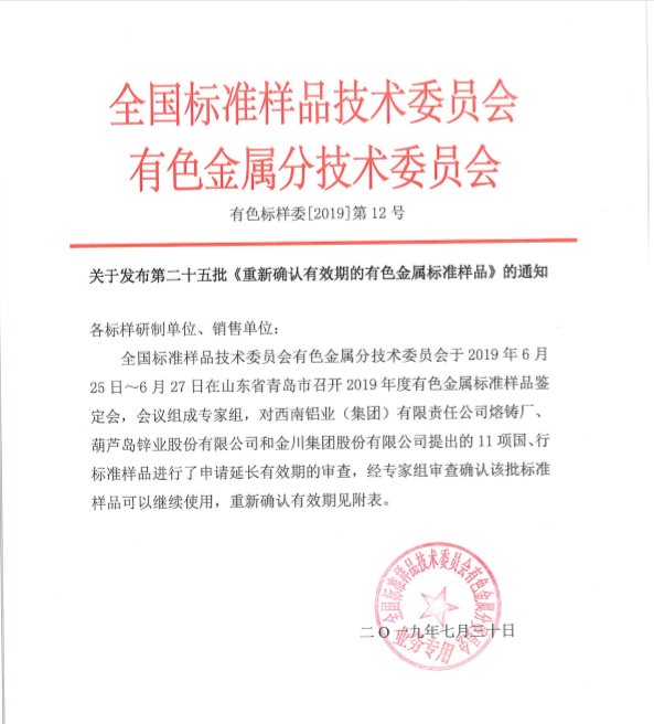 全國標(biāo)準(zhǔn)樣品技術(shù)委員會有色金屬分技術(shù)委員會于2019年6月25日一6月27日在山東省青島市召開2019年度有色金屬標(biāo)準(zhǔn)樣品鑒定會,會議組成專家組,對西南鋁業(yè)(集團)有限責(zé)任公司熔鑄廠、葫蘆島鋅業(yè)股份有限公司和金川集團股份有限公司提出的11項國、行標(biāo)準(zhǔn)樣品進(jìn)行了申請延長有效期的審查,經(jīng)專家組審查確認(rèn)該批標(biāo)準(zhǔn)樣品可以繼續(xù)使用,重新確認(rèn)有效期見附表。