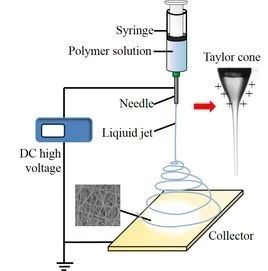 靜電紡絲(也稱電紡絲)工作原理:在靜電紡絲過程中,噴射裝置中裝滿了充電的聚合物溶液或熔融液。在外加電場作用下,受表面張力作用而保持在噴嘴處的高分子液滴。在電場誘導下,液滴表面聚集電荷,受到一個與表面張力方向相反的電場力。當電場逐漸增強時,噴嘴處的液滴由球狀被拉長為錐狀,形成所謂的泰勒錐(Taylor cone)。而當電場強度增加至一個臨界值時,電場力就會克服液體的表面張力,噴射流從泰勒錐中噴出。噴射流在高電場的作用下發(fā)生震蕩而不穩(wěn)定,產生頻率極高的不規(guī)則性螺旋運動。在高速震蕩中,噴射流被迅速拉細,溶劑也迅速揮發(fā),最終形成直徑在納米級的纖維,并以隨機的方式散落在收集裝置上,形成無紡布。