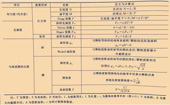 形狀指數(shù):形狀指數(shù)是以顆粒外截形體幾何參量的無(wú)因次數(shù)組來(lái)表示顆粒的形狀特征。顆粒的各種形狀指數(shù)如表4所示。