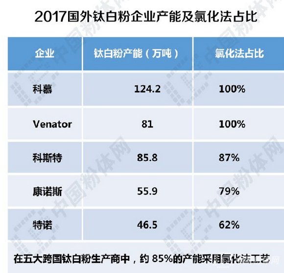 2017年,中國氯化法鈦白粉產(chǎn)量僅占全國鈦白粉總產(chǎn)量5.83%,全國5家氯化法鈦白粉生產(chǎn)企業(yè)(龍蟒佰利、錦州鈦業(yè)、云南新立、漯河興茂、攀鋼釩鈦)的合計產(chǎn)量為16.75萬噸。而國際龍頭企業(yè)科慕2017年氯化法鈦白粉的年產(chǎn)能為124.2萬噸。