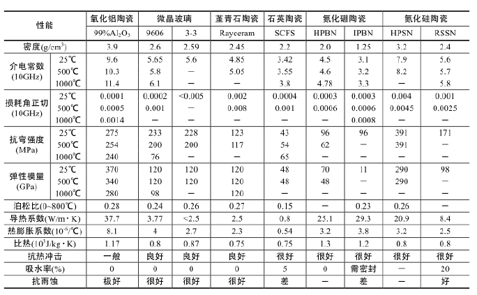 早期的天線罩材料為有機(jī)聚合物及其纖維織物增強(qiáng)復(fù)合材料,隨著航空航天技術(shù)的發(fā)展,諸多飛行器的飛行速度大幅提升,現(xiàn)今導(dǎo)彈的普遍速度更是達(dá)到2Ma以上,由于有機(jī)聚合物在高溫下會(huì)裂解,已經(jīng)無法適應(yīng)高速飛行帶來的惡劣環(huán)境,有機(jī)聚合物材料逐漸被時(shí)代所淘汰。目前,國內(nèi)外天線罩材料主要有氧化鋁、石英、氮化物、微晶玻璃等。