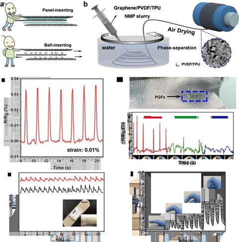 為解決上述問題,中國科學(xué)院上海微系統(tǒng)與信息技術(shù)研究所研究員丁古巧課題組提出了通過結(jié)構(gòu)化設(shè)計(jì)減少石墨烯與高分子接觸面積來提高靈敏度的策略。他們利用石墨烯/聚偏氟乙烯/聚氨酯DMF體系在水相的相分離過程,制備了高分子納米球修飾的石墨烯多孔網(wǎng)絡(luò)纖維,這種結(jié)構(gòu)大幅增強(qiáng)了該纖維在發(fā)生形變時(shí)石墨烯片層之間的結(jié)構(gòu)變化,從而實(shí)現(xiàn)石墨烯基纖維靈敏度的顯著提高。其靈敏度因子值在0-5%應(yīng)變時(shí)為51,在5-8%應(yīng)變時(shí)達(dá)到87,通過編織集成,他們進(jìn)一步驗(yàn)證了該纖維在人體重要信號收集的準(zhǔn)確性和對不同動(dòng)作狀態(tài)分析的可行性。同時(shí),這種新型石墨烯基纖維傳感器最低形變檢測限達(dá)到0.01%,較好的應(yīng)變-電阻線性關(guān)系可保證在信號后處理上的準(zhǔn)確性,>6000次的循環(huán)壽命有利于實(shí)際應(yīng)用的穩(wěn)定性。