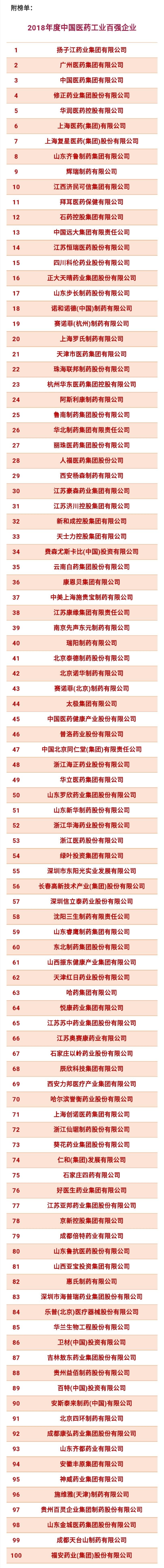中國粉體網(wǎng)訊 8月25日,由中國醫(yī)藥工業(yè)信息中心主辦的2019年(第36屆)全國醫(yī)藥工業(yè)信息年會在連云港開幕,大會發(fā)布了2018年度中國醫(yī)藥工業(yè)百強(qiáng)企業(yè)榜單。與上一年度榜單相比,揚子江藥業(yè)集團(tuán)有限公司與廣州醫(yī)藥集團(tuán)有限公司繼續(xù)領(lǐng)跑榜單,蟬聯(lián)冠亞軍,而中國醫(yī)藥集團(tuán)有限公司擠掉修正藥業(yè),強(qiáng)勢躋身前三。