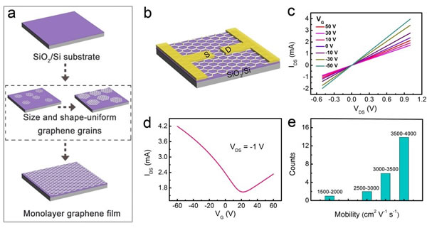 近日,研究人員采用了一種新的前驅(qū)體調(diào)控策略成功地抑制了石墨烯的二次成核,從而在絕緣基底上直接生長(zhǎng)出大面積高質(zhì)量的均勻單層石墨烯薄膜。通過對(duì)石墨烯生長(zhǎng)機(jī)理的研究得知,二氧化硅襯底表面的羥基化弱化了石墨烯邊緣與襯底之間的結(jié)合,進(jìn)而實(shí)現(xiàn)了初級(jí)成核主導(dǎo)的石墨烯生長(zhǎng)。場(chǎng)效應(yīng)晶體管(FET)器件測(cè)試結(jié)果顯示出制備的均勻單層石墨烯膜具有優(yōu)異的電學(xué)性能,遷移率最高達(dá)到3800 cm2 V-1 s-1,是目前絕緣基底上生長(zhǎng)的石墨烯薄膜器件的性能最高值。這種無需任何復(fù)雜的轉(zhuǎn)移過程,簡(jiǎn)便可控在絕緣基底上制備高質(zhì)量石墨烯薄膜的方法,使石墨烯在集成電子和光電子領(lǐng)域中的應(yīng)用又邁進(jìn)了一步。該工作中,研究人員與清華大學(xué)工程力學(xué)系教授徐志平課題組在石墨烯生長(zhǎng)機(jī)理方面開展了密切的合作研究,相關(guān)研究成果發(fā)表于《美國(guó)化學(xué)會(huì)志》上(J. Am. Chem. Soc.,2019, 141, 11004-11008),通訊作者為于貴和徐志平,第一作者為王華平。