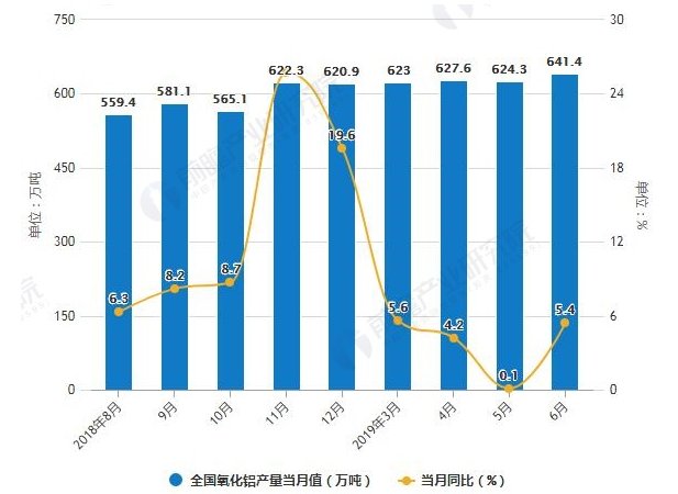 2018-2019年6月全國氧化鋁產(chǎn)量統(tǒng)計及增長情況