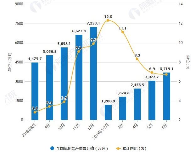 據(jù)公開統(tǒng)計數(shù)據(jù)顯示,2018年全年全國氧化鋁產(chǎn)量高達7253.1萬噸,累計增長9.9%。截止至2019年6月全國氧化鋁產(chǎn)量為641.4萬噸,同比增長5.4%。累計方面,2019年1-6月全國氧化鋁產(chǎn)量達到3719.1萬噸,同比增長6.7%。
