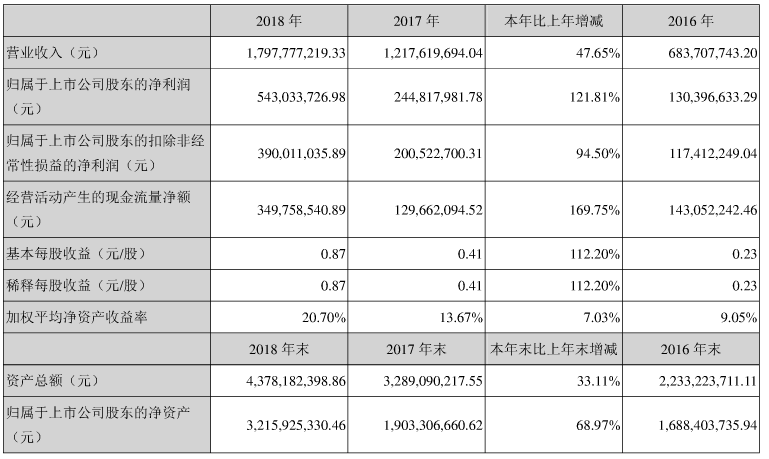 公司業(yè)績:公司2018年實現營業(yè)收入17.98億元,較上年同期增長47.65%,歸屬于上市公司股東的凈利潤5.43億元,比上年同期增長121.81%。每股收益0.87元。