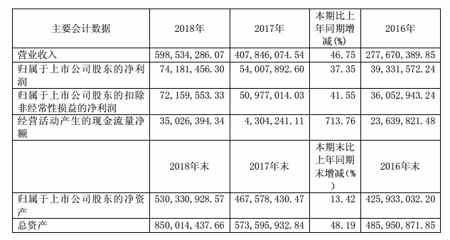 公司業(yè)績:2018年,公司實現營業(yè)收入為59,853.43萬元,同比上升46.75%;歸屬于上市公司股東的凈利潤為7,418.15萬元,同比增長37.35%。