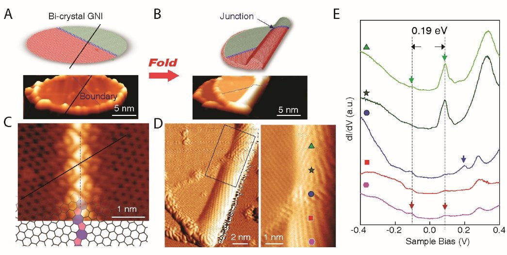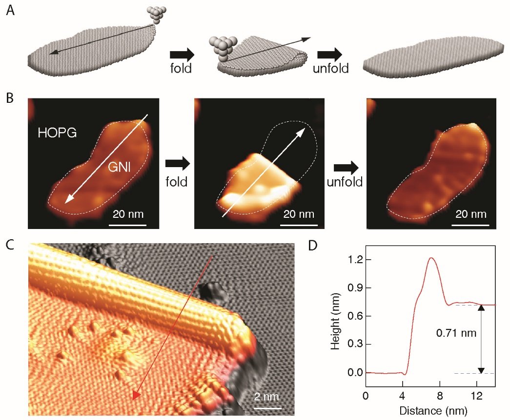 “折紙術”是一種把紙張折出各種特定形狀和花樣的藝術。藝術家們通過精妙的手法,把簡單與單調(diào)的二維紙張變成豐富多彩的三維結構。受這種藝術的啟發(fā),折疊操縱經(jīng)常被巧妙地用在很多科學技術前沿領域,用來構筑形狀與功能各異的結構、器件甚至機器,例如生物學領域可以將DNA單鏈折疊成復雜的二維形狀。在宏觀尺度下,受折紙術的啟發(fā),科學家已經(jīng)能夠構建出石墨烯功能器件甚至機器模型。理論預測發(fā)現(xiàn),在原子尺度,通過對石墨烯的彎曲折疊,可以構筑出具有新奇電子學特性的納米結構。然而,石墨烯彎曲結構的電子學性質(zhì)容易受到局域的空位、增原子、邊界等缺陷結構的影響。在單原子尺度精確地折疊石墨烯,特別是根據(jù)特殊需要沿特定方向?qū)κ┻M行折疊,具有極大的挑戰(zhàn)性。