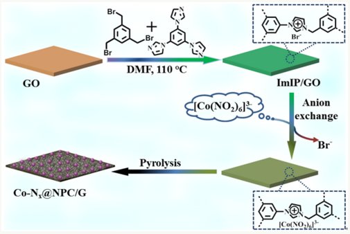 隔膜也是電池的重要組成之一,其作用是導(dǎo)通離子傳輸并防止電池短路。商業(yè)化PP 隔膜,由于其孔徑較大,多硫化物能夠較容易地通過,因而不能有效地抑制多硫化物的擴(kuò)散和穿梭。在國家自然科學(xué)基金(21471151, 21673241))和中國科學(xué)院戰(zhàn)略性先導(dǎo)科技專項(xiàng)(XDB20030200)的資助下,中科院福建物質(zhì)結(jié)構(gòu)研究所結(jié)構(gòu)化學(xué)國家重點(diǎn)實(shí)驗(yàn)室研究員王瑞虎課題組利用金屬納米粒的催化效應(yīng),以離子聚合物包覆氧化石墨烯為前驅(qū)體,通過離子交換和高溫焙燒技術(shù)制備得到了鈷、氮均勻摻雜的多孔碳納米片復(fù)合材料。該復(fù)合材料修飾的隔膜不僅可以通過物理/化學(xué)作用有效阻擋多硫化物穿梭通過隔膜,而且可以起到電催化劑作用,進(jìn)一步促進(jìn)被攔截的多硫化物進(jìn)行催化轉(zhuǎn)化。使用催化效應(yīng)助力的修飾隔膜,高載硫(10.5 mg cm-2)自支撐電極在0.1 C的條件下表現(xiàn)出高的放電面容量(12.5 mA h cm-2)和體積比容量(1136 mA h cm-3)。該電化學(xué)性能優(yōu)于目前報(bào)道的大多數(shù)碳基正極材料,實(shí)現(xiàn)了鋰硫電池硫負(fù)載量、體積容量和面容量的同步提升,這對(duì)高能量密度鋰硫電池的設(shè)計(jì)構(gòu)筑具有重要意義。