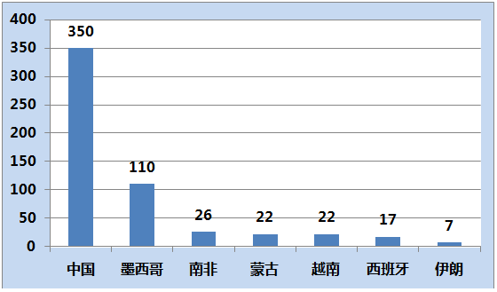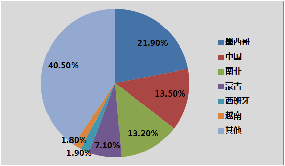 2018年全球主要國家螢石產(chǎn)量分布情況(萬噸)