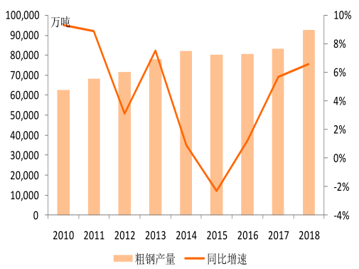 2010- -2018 年我國粗鋼產(chǎn)量及增速