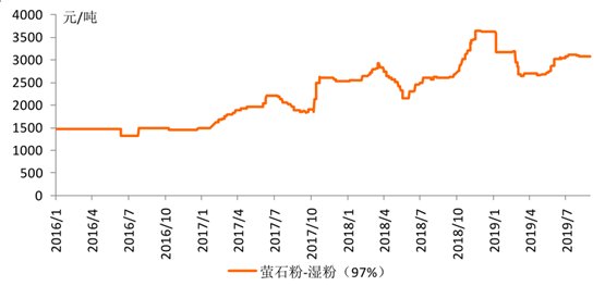 行業(yè)景氣度向好,螢石價(jià)格 維持上行趨勢。2019二季度以來,受內(nèi)蒙古地區(qū)礦山整改以及環(huán)保壓力的影響,螢石礦山及選廠開工情況不佳,螢石塊市場供應(yīng)相對(duì)偏緊,而下游需求相對(duì)穩(wěn)定,螢石粉價(jià)格企穩(wěn)回升。