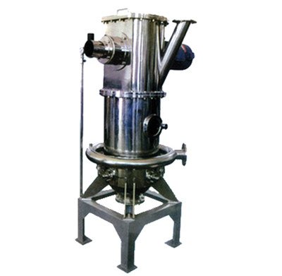 原料從進(jìn)料口加入后,落在分級轉(zhuǎn)子的分散板處,在離心力作用下,落入分級室,在此受導(dǎo)流葉片產(chǎn)生的自由氣流漩渦(1次分級)和高速轉(zhuǎn)子產(chǎn)生的強(qiáng)制氣流漩渦(2次分級)的共同作用,進(jìn)行分級,粗粉落入下部料斗,細(xì)粉導(dǎo)入上部出口排出被收集。