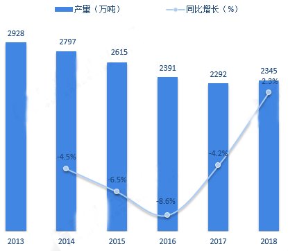 根據(jù)工信部數(shù)據(jù)統(tǒng)計,2018年,全國耐火材料產(chǎn)量2345.22萬噸,同比增長2.30%。2019年上半年,全國耐火材料產(chǎn)量為911.12萬噸,同比降低3.62%。