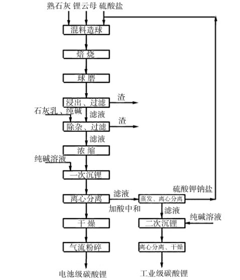 采用硫酸鹽與一定量的鋰云母在高溫下焙燒,將鋰云母中的鋰轉(zhuǎn)化為易溶解的硫酸鋰,之后采用水浸的方法回收其中的鋰資源。