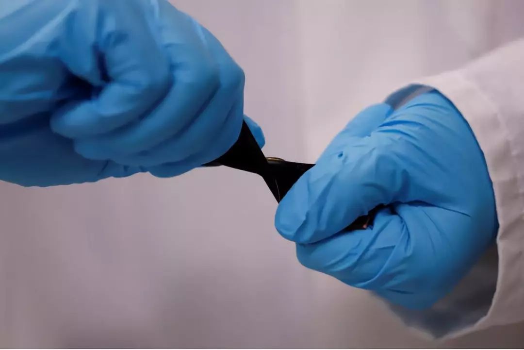 第一種材料,是一層由有彈性的聚合物制成的薄膜,作為集流體的基底;第二和第三種材料,是分散在基底里面的碳納米管和碳黑顆粒。這些可以導(dǎo)電的填充物,讓基底擁有了一定的導(dǎo)電性。而徹底解決導(dǎo)電性問題,最關(guān)鍵的是第四種材料——沉積在基底表面的一層銀膠。