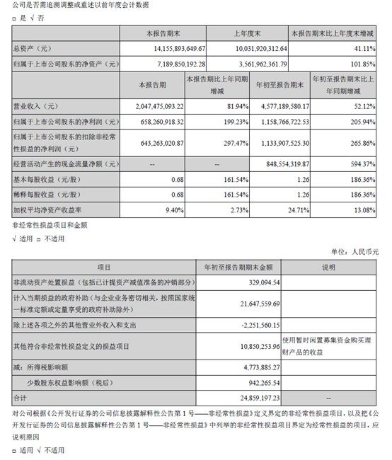 中國粉體網(wǎng)訊 10月25日晚間披露2019年三季報(bào),公司1月—9月實(shí)現(xiàn)營業(yè)收入45.77億元,同比增長52.12%;實(shí)現(xiàn)歸屬于上市公司股東的凈利潤11.59億元,同比增長205.94%;經(jīng)營活動(dòng)產(chǎn)生的現(xiàn)金流凈額8.49億元,同比增幅高達(dá)594.37%。