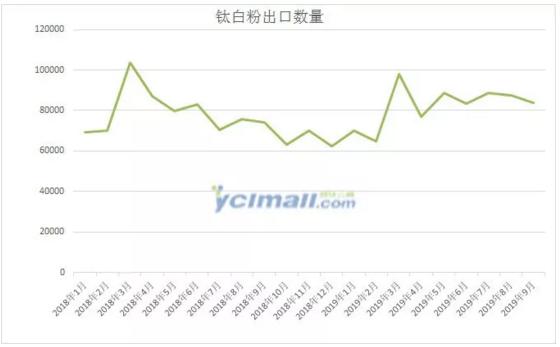 2019年9月我國鈦白粉出口量為83805.49噸,環(huán)比減少4.06%,同比增加13.29%,當(dāng)月出口均價(jià)為2123.43美元/噸。2019年1-9月鈦白粉累計(jì)出口量為741383.16噸,累計(jì)出口均價(jià)為2233.63美元/噸,同比增加4.03%。