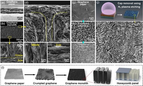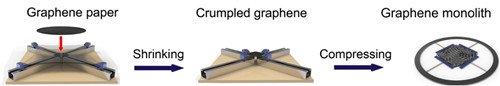 近日,中國(guó)科學(xué)院寧波材料技術(shù)與工程研究所表面事業(yè)部功能碳素材料團(tuán)隊(duì)制備了一種基于垂直排列石墨烯結(jié)構(gòu)的具有高導(dǎo)熱系數(shù)低壓縮模量的熱界面材料。該材料的制備過(guò)程如圖1所示:對(duì)抽濾的石墨烯紙施加橫向機(jī)械力,使石墨烯具有褶皺結(jié)構(gòu),然后施加壓力得到密實(shí)的石墨烯導(dǎo)熱墊。該方法使得石墨烯紙的取向由水平變成垂直,實(shí)現(xiàn)了石墨烯紙水平傳熱到垂直傳熱的轉(zhuǎn)變。