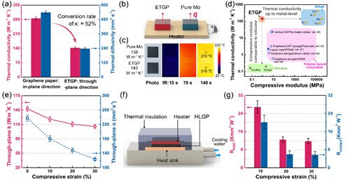 圖2(a–k)為石墨烯導(dǎo)熱墊在制備過(guò)程中各階段的形貌變化,最終的石墨烯導(dǎo)熱墊在微觀上呈現(xiàn)多層結(jié)構(gòu),中間以垂直排列的石墨烯為主,頂部和底部有一薄層水平排列的石墨烯,整體結(jié)構(gòu)與蜂巢板類(lèi)似(如圖2(l))。實(shí)驗(yàn)所用的作為原料的石墨烯紙的面內(nèi)熱導(dǎo)率為273Wm-1K-1,經(jīng)過(guò)結(jié)構(gòu)轉(zhuǎn)制之后所得到的石墨烯導(dǎo)熱墊的縱向熱導(dǎo)率為143Wm-1K-1(轉(zhuǎn)化率達(dá)52%),已經(jīng)超過(guò)了大多數(shù)的金屬(如Mo、Zn、In、Ni、Fe等),相應(yīng)的結(jié)果見(jiàn)圖3(a–d)。除了擁有高的導(dǎo)熱系數(shù),該石墨烯導(dǎo)熱墊還具有與硅膠相當(dāng)?shù)膲嚎s模量,僅有0.87MPa,遠(yuǎn)低于金屬材料(圖3d),有利于在封裝時(shí)產(chǎn)生變形,實(shí)現(xiàn)較低的接觸熱阻。在30%壓縮率下,石墨烯導(dǎo)熱墊的面外熱導(dǎo)率仍超過(guò)了100Wm-1K-1,接觸熱阻低至5.8Kmm2 W-1,如圖3(e–g)所示。