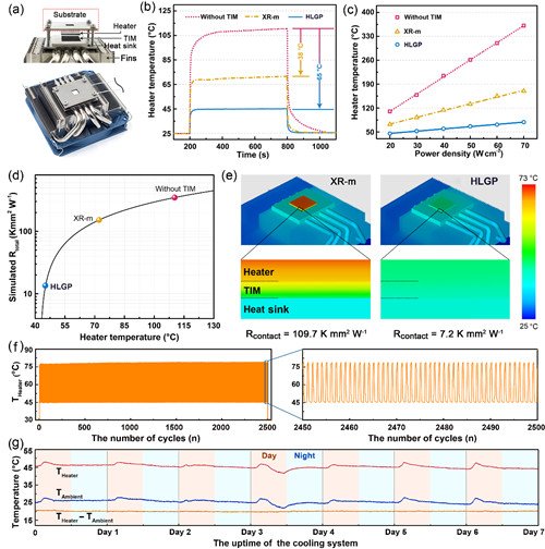 在實(shí)際的熱界面性能評(píng)測(cè)實(shí)驗(yàn)中,以石墨烯導(dǎo)熱墊作為熱界面材料的系統(tǒng)熱源溫降達(dá)到65℃,遠(yuǎn)高于應(yīng)用商用熱界面材料所實(shí)現(xiàn)的溫降(38℃),實(shí)驗(yàn)結(jié)果如圖4(a–c)所示。圖4(d–e)為CFD仿真軟件對(duì)散熱過(guò)程的模擬,結(jié)果顯示石墨烯導(dǎo)熱墊的接觸熱阻低于主流的商用導(dǎo)熱墊。在圖4f中,石墨烯導(dǎo)熱墊表現(xiàn)出了良好的熱循環(huán)穩(wěn)定性,在經(jīng)過(guò)2500次熱沖擊測(cè)試后散熱性能波動(dòng)低于0.5%;除此之外,該石墨烯導(dǎo)熱墊還具有長(zhǎng)時(shí)穩(wěn)定性,在20Wcm-2的功率下連續(xù)工作7天,加熱片與環(huán)境溫度的差值無(wú)明顯變化(圖4g),顯示出良好的熱沖擊穩(wěn)定性以及長(zhǎng)程穩(wěn)定性。目前相關(guān)工作已經(jīng)發(fā)表在ACS Nano (2019, DOI: 10.1021/acsnano.9b05163)。該研究工作獲得國(guó)家重點(diǎn)研發(fā)計(jì)劃(2017YFB0406000)、中科院戰(zhàn)略重點(diǎn)研究計(jì)劃(XDA22000000)、中科院裝備(YZ201640)、寧波市重大專(zhuān)項(xiàng)(2016S1002和2016B10038)以及寧波市國(guó)際合作(2017D10016)的資助。
