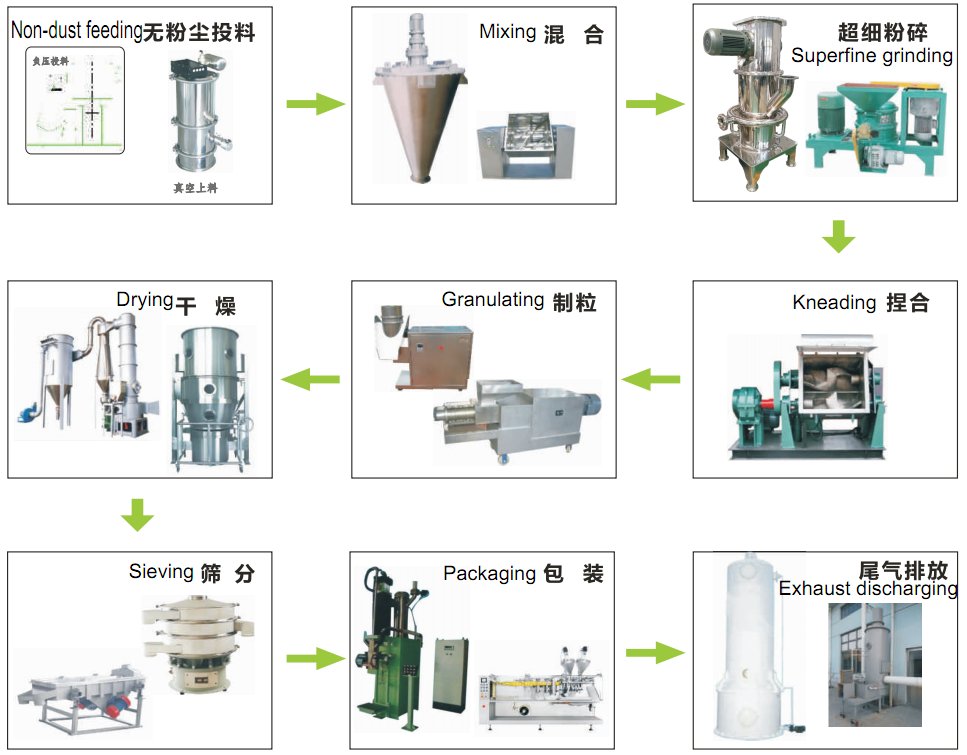 粒型可濕性粉劑(又稱水分散粒劑或干懸浮劑),其原料為可濕性粉劑通過制粒而形成的一旦放入水中,能較快的崩解。分散,形成高懸浮的固液分散體系的粒狀制劑。造粒操作單元是整套工藝的核心。造粒機(jī)是確定農(nóng)藥造粒,干燥工藝流程配置的關(guān)鍵,依據(jù)農(nóng)藥的特性,實(shí)驗(yàn)數(shù)據(jù)及工程應(yīng)用實(shí)例,選用旋轉(zhuǎn)擠壓造粒機(jī)或雙螺桿擠出造粒機(jī)(傳動(dòng)軸部分加冷卻水系統(tǒng))或螺桿造粒機(jī)(造粒腔體部分加冷卻水系統(tǒng))或流化床造粒機(jī)(流化床造粒工藝與擠壓造粒工藝不同),其造粒所需的濕含量約為8-18%。根據(jù)產(chǎn)品特性及生產(chǎn)工藝情況,確定本工藝設(shè)計(jì)方案主要由:捏合,造粒,干燥,篩分,包裝,熱風(fēng)系統(tǒng),除塵系統(tǒng)組成。