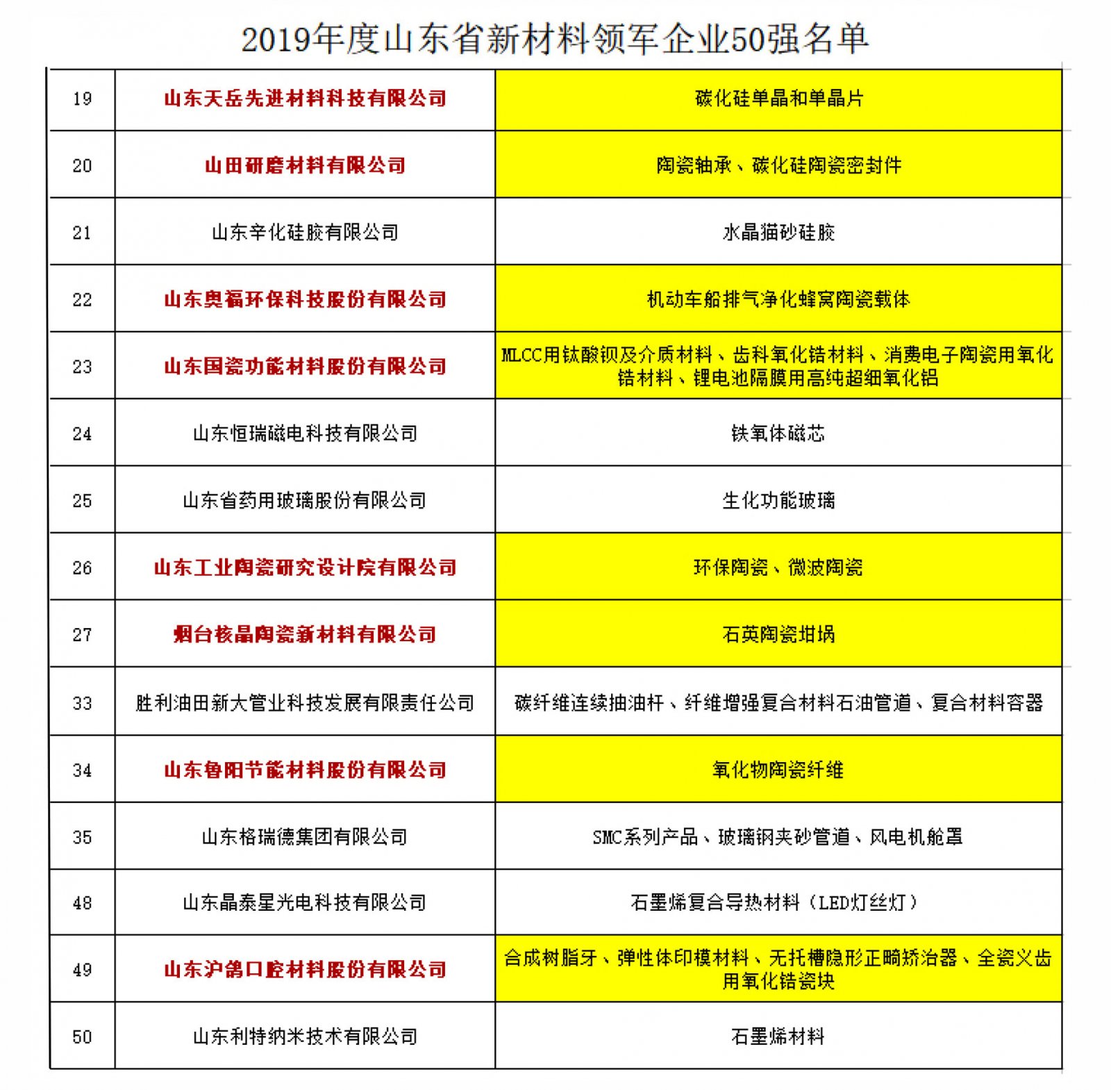 其中,山東天岳先進(jìn)材料科技有限公司、山田研磨材料有限公司、山東奧福環(huán)?萍脊煞萦邢薰尽⑸綎|國瓷功能材料股份有限公司、山東工業(yè)陶瓷研究設(shè)計(jì)院有限公司、煙臺核晶陶瓷新材料有限公司、山東魯能節(jié)能材料股份有限公司及山東滬鴿口腔材料股份有限公司共8家特種陶瓷相關(guān)企業(yè)入選。